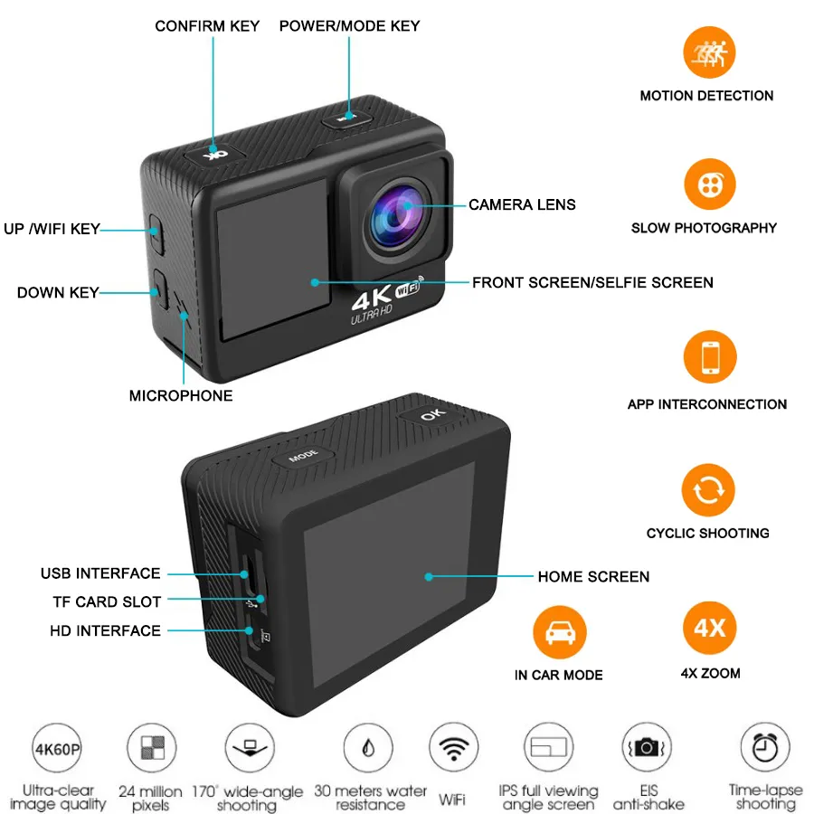 Le caméscope de sport prend des photos de haute qualité avec une caméra d’action dotée d’une vidéo professionnelle 4K / 30FPS Ultra HD avec écran LCD de 2 pouces et objectif ultra grand angle visible à 170° degrés. Caméra vidéo abordable, petite et élégante caméra d’action 4K Wi-Fi.